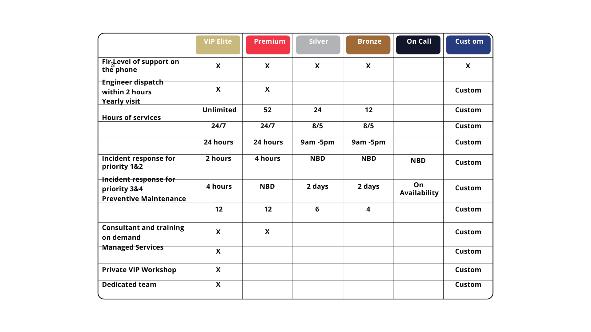- 12 incidents per year with 8x5xNBD for Priority 1 and Priority 2 incidents and 2 business days for lower priorities.